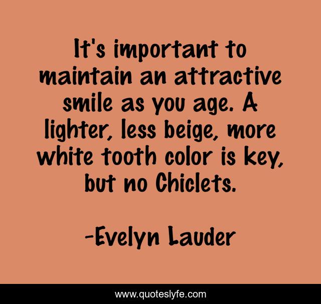 This page presents the quote "It's important to maintain an attractive smile as you age. A lighter, less beige, more white tooth color is key, but no Chiclets.". Author of this quote is Evelyn Lauder. This quote is about color, age,.