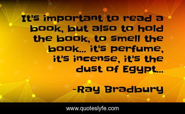 This page presents the quote "It's important to read a book, but also to hold the book, to smell the book... it's perfume, it's incense, it's the dust of Egypt...". Author of this quote is Ray Bradbury. .