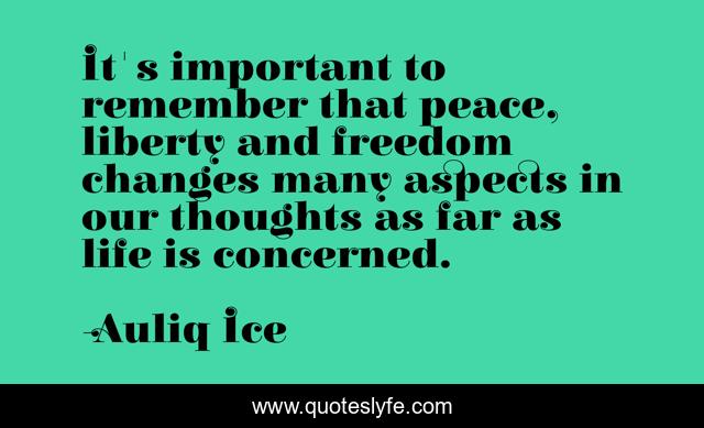 This page presents the quote "It's important to remember that peace, liberty and freedom changes many aspects in our thoughts as far as life is concerned.". Author of this quote is Auliq Ice. This quote is about success, democracy, justice, freedom, peace, liberty, peace-of-mind, change-leadership, change-life,.