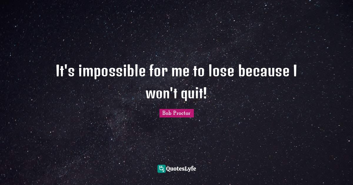 This page presents the quote "It's impossible for me to lose because I won't quit!". Author of this quote is Bob Proctor. This quote is about loses, quitting, impossible,.