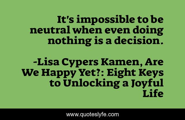 This page presents the quote "It's impossible to be neutral when even doing nothing is a decision.". Author of this quote is Lisa Cypers Kamen, Are We Happy Yet?: Eight Keys to Unlocking a Joyful Life. This quote is about complacency, actions, indecision,.