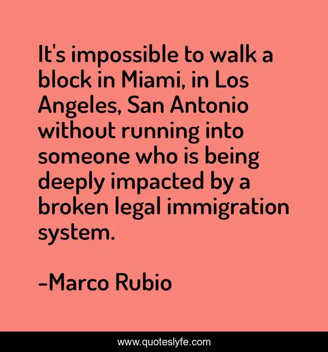 This page presents the quote "It's impossible to walk a block in Miami, in Los Angeles, San Antonio without running into someone who is being deeply impacted by a broken legal immigration system.". Author of this quote is Marco Rubio. This quote is about impossible, walk, broken,.