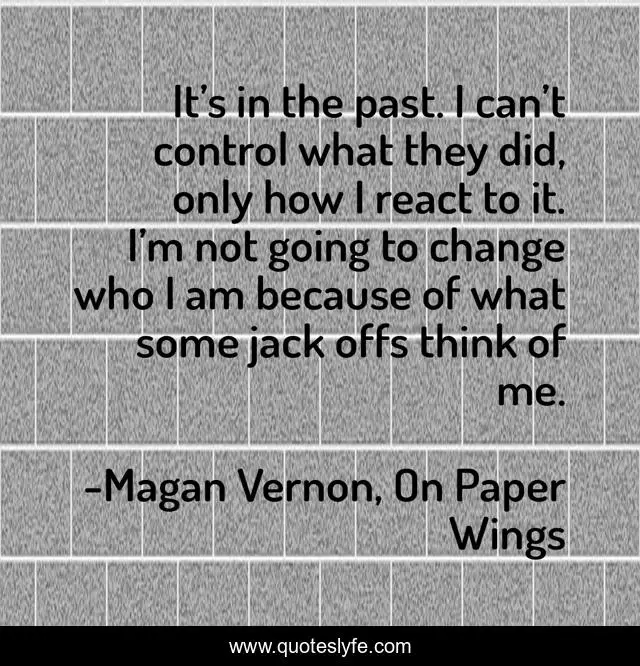 This page presents the quote "It’s in the past. I can’t control what they did, only how I react to it. I’m not going to change who I am because of what some jack offs think of me.". Author of this quote is Magan Vernon, On Paper Wings. This quote is about new-adult, new-adult-contemporary-romance, new-adult-romance, new-adult-fiction, new-adult-lit,.