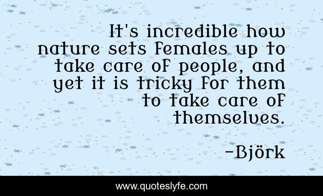 This page presents the quote "It's incredible how nature sets females up to take care of people, and yet it is tricky for them to take care of themselves.". Author of this quote is Björk. This quote is about motherhood, care, females, nature,.