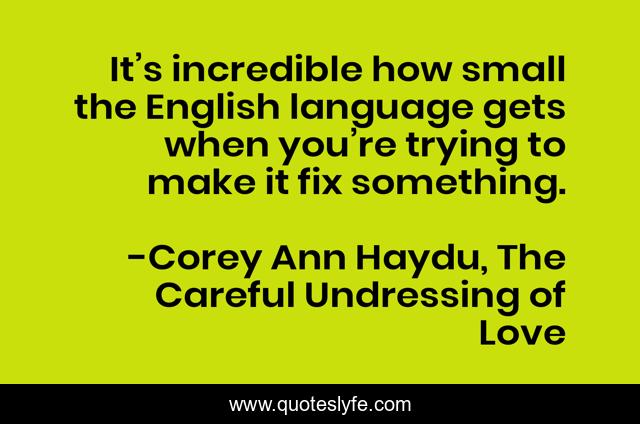 This page presents the quote "It’s incredible how small the English language gets when you’re trying to make it fix something.". Author of this quote is Corey Ann Haydu, The Careful Undressing of Love. This quote is about loss, love, language, creativity, writing, speaking, affection,.