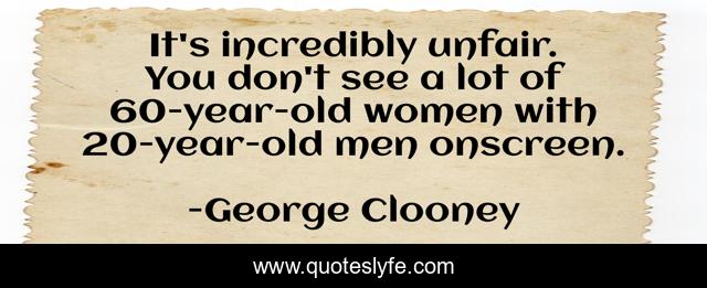 This page presents the quote "It's incredibly unfair. You don't see a lot of 60-year-old women with 20-year-old men onscreen.". Author of this quote is George Clooney. This quote is about see, men,.
