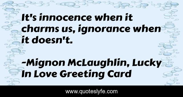 This page presents the quote "It's innocence when it charms us, ignorance when it doesn't.". Author of this quote is Mignon McLaughlin, Lucky In Love Greeting Card. This quote is about love, ignorance, affection, innocence,.