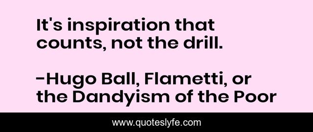 This page presents the quote "It's inspiration that counts, not the drill.". Author of this quote is Hugo Ball, Flametti, or the Dandyism of the Poor. This quote is about drama, life, innovation,.