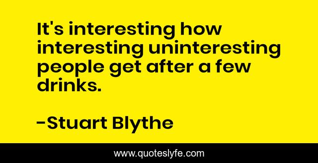 This page presents the quote "It's interesting how interesting uninteresting people get after a few drinks.". Author of this quote is Stuart Blythe. This quote is about fun, interesting, drinks, people,.