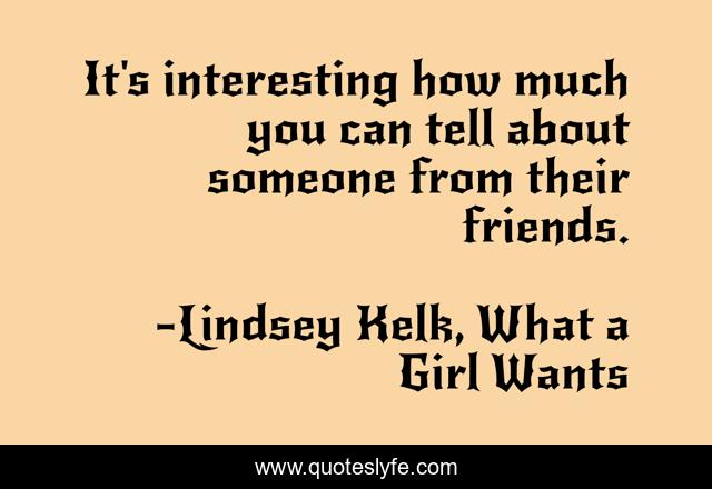 This page presents the quote "It's interesting how much you can tell about someone from their friends.". Author of this quote is Lindsey Kelk, What a Girl Wants. This quote is about fashion, love, photographer, milan, passion, adventure, girl, friendship, affection,.