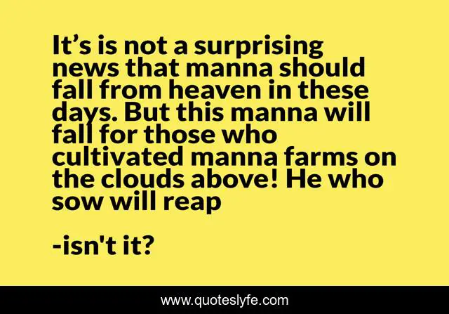 This page presents the quote "It’s is not a surprising news that manna should fall from heaven in these days. But this manna will fall for those who cultivated manna farms on the clouds above! He who sow will reap". Author of this quote is isn't it?. This quote is about israelmore ayivor, the great hand book of quotes,.