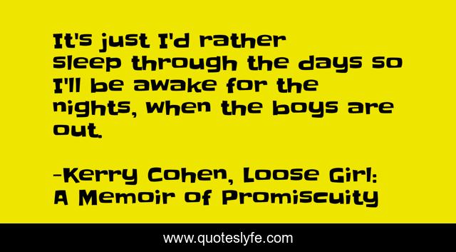 This page presents the quote "It's just I'd rather sleep through the days so I'll be awake for the nights, when the boys are out.". Author of this quote is Kerry Cohen, Loose Girl: A Memoir of Promiscuity. This quote is about boys, night-life, sleep,.