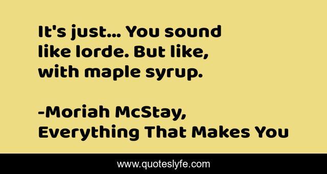 This page presents the quote "It's just... You sound like lorde. But like, with maple syrup.". Author of this quote is Moriah McStay, Everything That Makes You. This quote is about funny, food, light, music, comedy, laughter,.