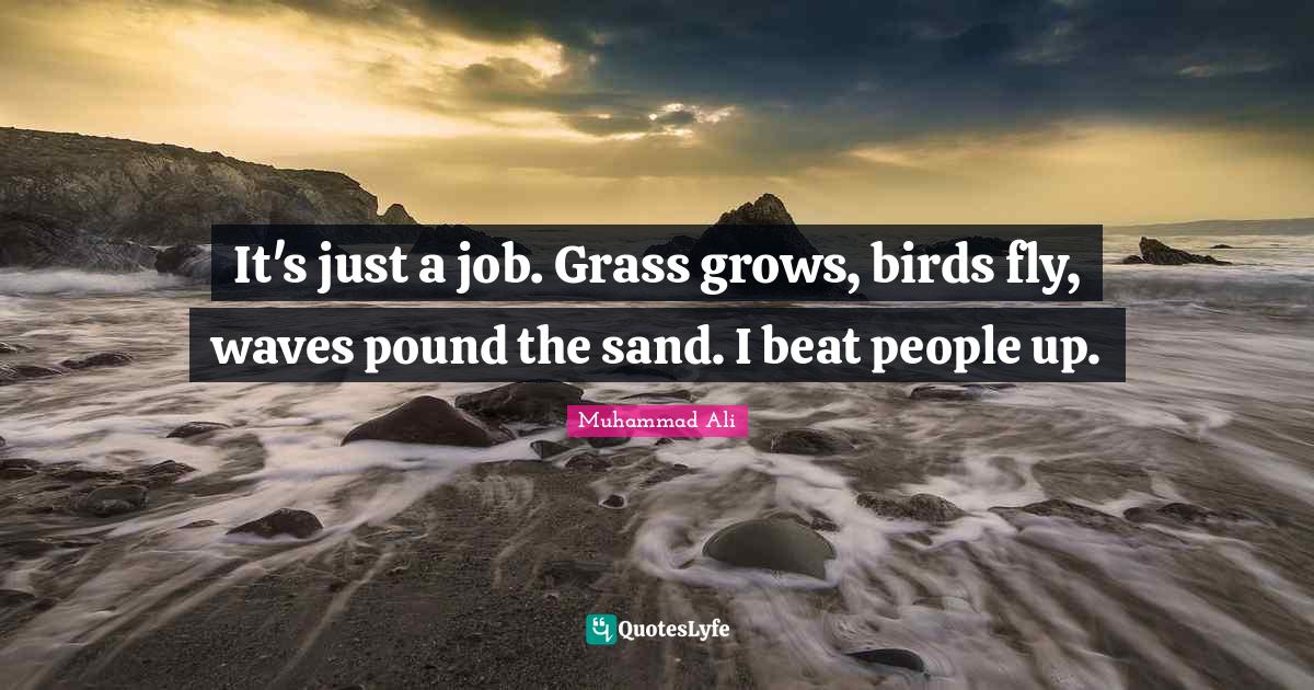 This page presents the quote "It's just a job. Grass grows, birds fly, waves pound the sand. I beat people up.". Author of this quote is Muhammad Ali. This quote is about fly, job, birds,.