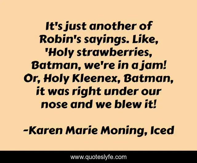This page presents the quote "It's just another of Robin's sayings. Like, 'Holy strawberries, Batman, we're in a jam! Or, Holy Kleenex, Batman, it was right under our nose and we blew it!". Author of this quote is Karen Marie Moning, Iced. This quote is about batman-robin, humor, dani-o-malley,.