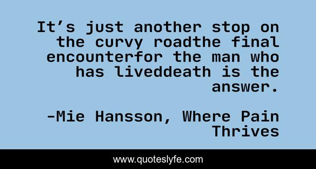 This page presents the quote "It’s just another stop on the curvy roadthe final encounterfor the man who has liveddeath is the answer.". Author of this quote is Mie Hansson, Where Pain Thrives. This quote is about where-pain-thrives, attitude-inspiration, death, uplifting, power, coda, mie-hansson, poetry, strong-women,.