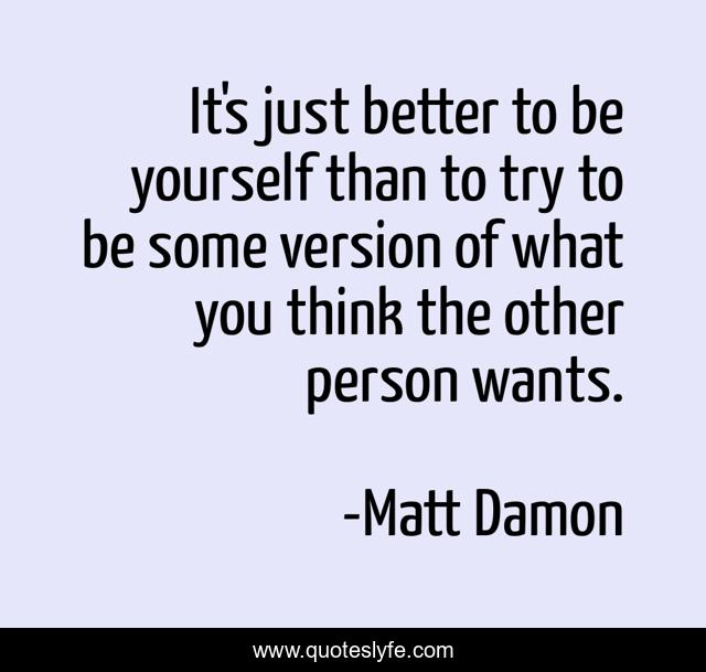 This page presents the quote "It's just better to be yourself than to try to be some version of what you think the other person wants.". Author of this quote is Matt Damon. This quote is about wants, better, just, be-yourself, yourself, try, person, version, think,.
