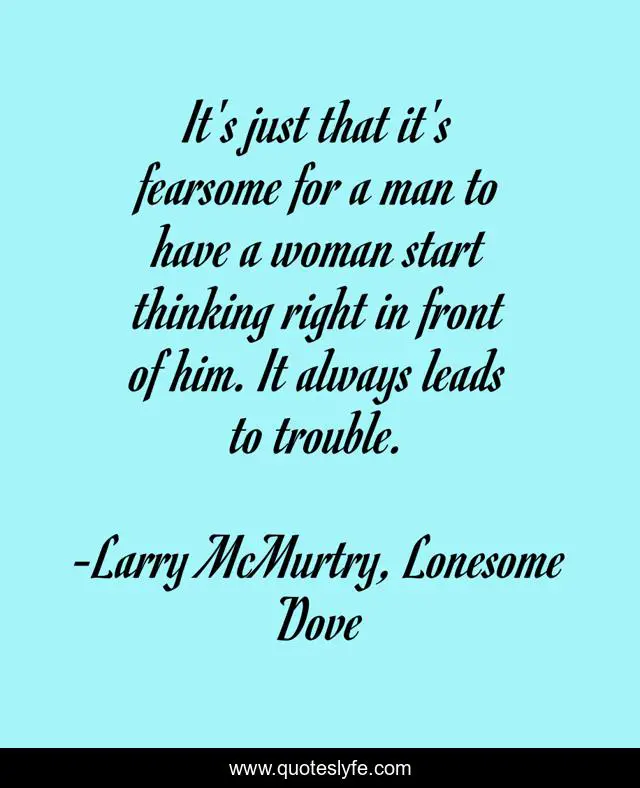 This page presents the quote "It's just that it's fearsome for a man to have a woman start thinking right in front of him. It always leads to trouble.". Author of this quote is Larry McMurtry, Lonesome Dove. This quote is about thinking, always, fear, woman, fearsome,.