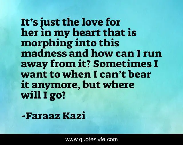 This page presents the quote "It’s just the love for her in my heart that is morphing into this madness and how can I run away from it? Sometimes I want to when I can’t bear it anymore, but where will I go?". Author of this quote is Faraaz Kazi. This quote is about romance, love, tragic, affection, sad,.
