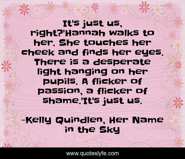This page presents the quote "It's just us, right?'Hannah walks to her. She touches her cheek and finds her eyes. There is a desperate light hanging on her pupils. A flicker of passion, a flicker of shame.'It's just us.". Author of this quote is Kelly Quindlen, Her Name in the Sky. .