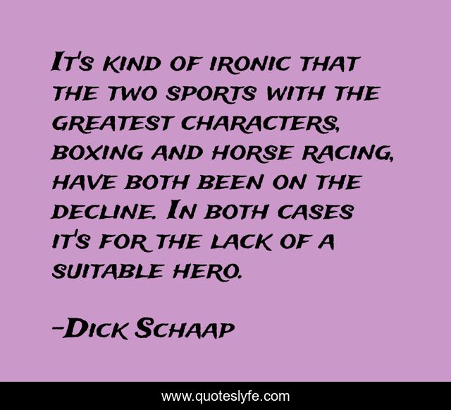 This page presents the quote "It's kind of ironic that the two sports with the greatest characters, boxing and horse racing, have both been on the decline. In both cases it's for the lack of a suitable hero.". Author of this quote is Dick Schaap. This quote is about horse, hero, greatest,.