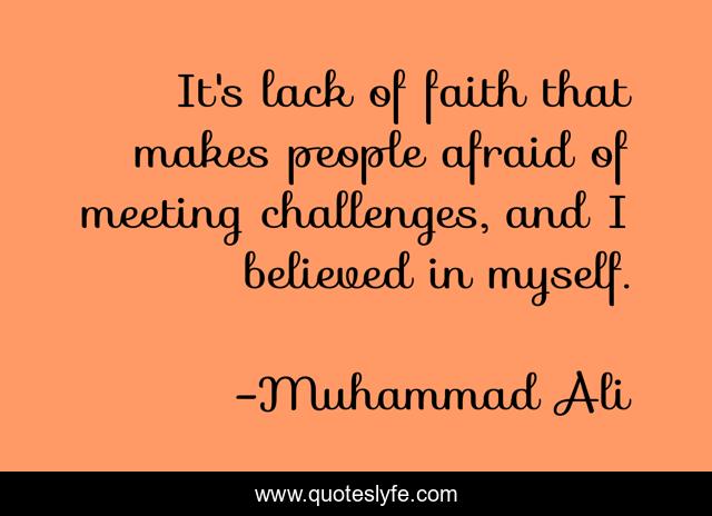 This page presents the quote "It's lack of faith that makes people afraid of meeting challenges, and I believed in myself.". Author of this quote is Muhammad Ali. This quote is about challenges, myself, people,.