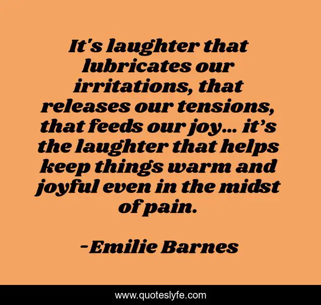 "Emilie Barnes Quotes." Quoteslyfe.com, 2025. Fri. 05 Dec. 2025. <https://www.quoteslyfe.com/quote/It-s-laughter-that-lubricates-our-irritations-97500>.