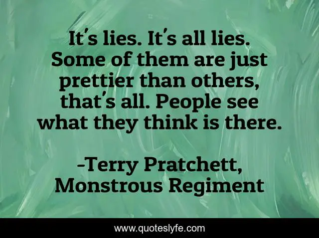 This page presents the quote "It's lies. It's all lies. Some of them are just prettier than others, that's all. People see what they think is there.". Author of this quote is Terry Pratchett, Monstrous Regiment. This quote is about lies, clarity-of-perception, despair, realism, reality,.