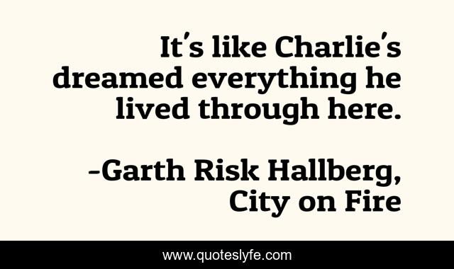 "Garth Risk Hallberg, City on Fire Quotes." Quoteslyfe.com, 2025. Mon. 08 Dec. 2025. <https://www.quoteslyfe.com/quote/It-s-like-Charlie-s-dreamed-everything-53564>.