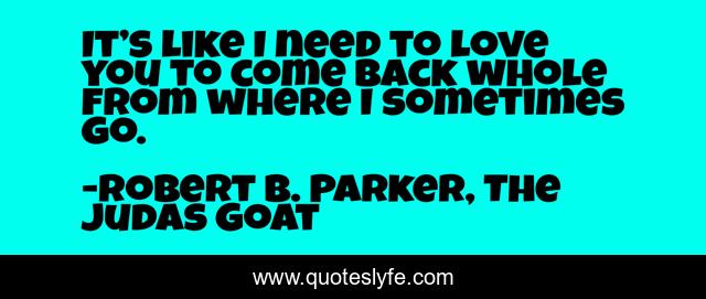 This page presents the quote "It’s like I need to love you to come back whole from where I sometimes go.". Author of this quote is Robert B. Parker, The Judas Goat. This quote is about relationships, sanity, love, healing, affection,.