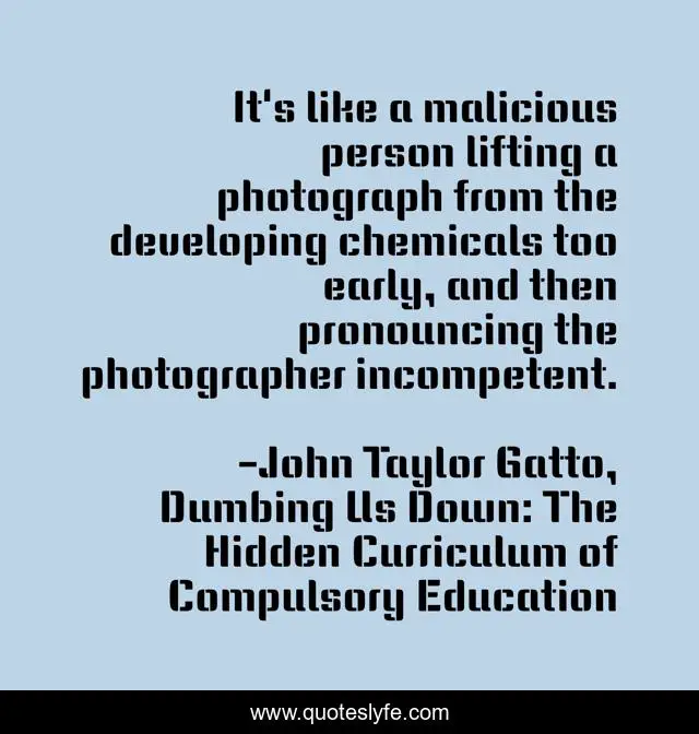 This page presents the quote "It's like a malicious person lifting a photograph from the developing chemicals too early, and then pronouncing the photographer incompetent.". Author of this quote is John Taylor Gatto, Dumbing Us Down: The Hidden Curriculum of Compulsory Education. This quote is about photography, education,.