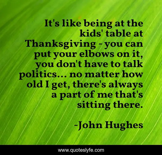 This page presents the quote "It's like being at the kids' table at Thanksgiving - you can put your elbows on it, you don't have to talk politics... no matter how old I get, there's always a part of me that's sitting there.". Author of this quote is John Hughes. This quote is about me, politics,.