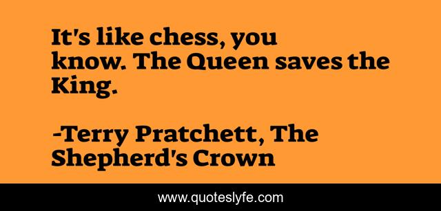 This page presents the quote "It's like chess, you know. The Queen saves the King.". Author of this quote is Terry Pratchett, The Shepherd's Crown. This quote is about discworld, gender, kings, queens,.