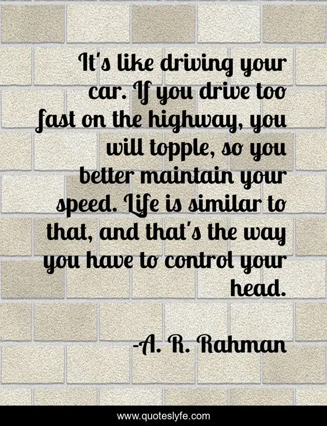 This page presents the quote "It's like driving your car. If you drive too fast on the highway, you will topple, so you better maintain your speed. Life is similar to that, and that's the way you have to control your head.". Author of this quote is A. R. Rahman. This quote is about control, life, speed,.