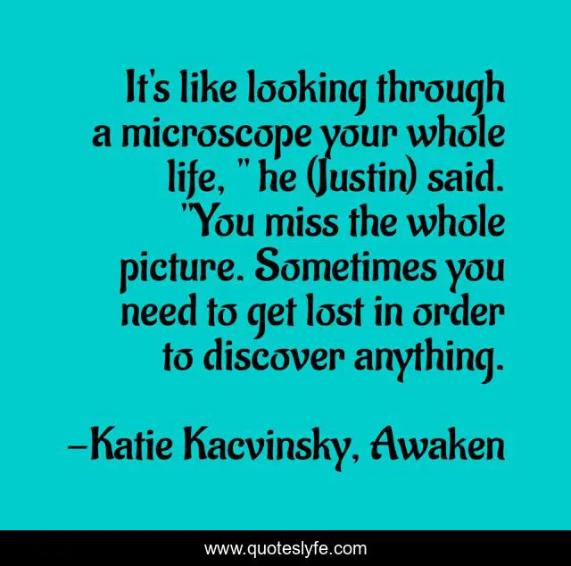This page presents the quote "It's like looking through a microscope your whole life, " he (Justin) said. "You miss the whole picture. Sometimes you need to get lost in order to discover anything.". Author of this quote is Katie Kacvinsky, Awaken. This quote is about myopia, lost, discovery,.
