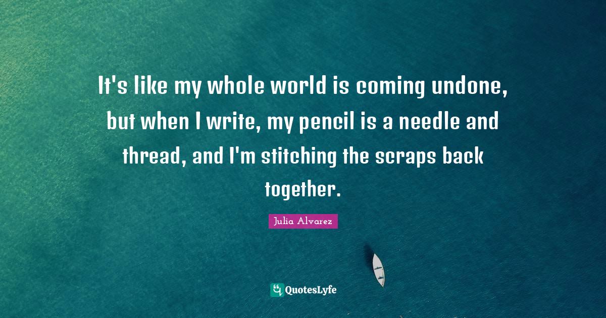 This page presents the quote "It's like my whole world is coming undone, but when I write, my pencil is a needle and thread, and I'm stitching the scraps back together.". Author of this quote is Julia Alvarez. This quote is about writing, undone, needle and thread, whole world, together, back together, world,.
