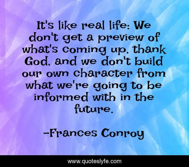 This page presents the quote "It's like real life: We don't get a preview of what's coming up, thank God, and we don't build our own character from what we're going to be informed with in the future.". Author of this quote is Frances Conroy. This quote is about god, life, character,.