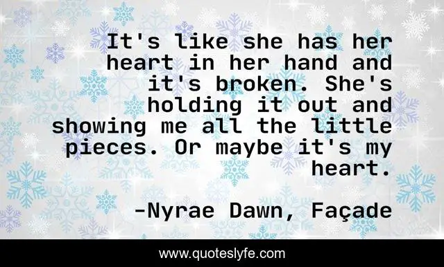 This page presents the quote "It's like she has her heart in her hand and it's broken. She's holding it out and showing me all the little pieces. Or maybe it's my heart.". Author of this quote is Nyrae Dawn, Façade. This quote is about grief, heartbreak,.