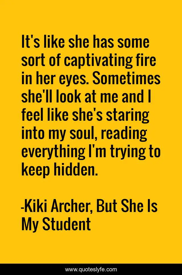 This page presents the quote "It's like she has some sort of captivating fire in her eyes. Sometimes she'll look at me and I feel like she's staring into my soul, reading everything I'm trying to keep hidden.". Author of this quote is Kiki Archer, But She Is My Student. This quote is about kiki-archer, love, captivating, secrets, soul, lust, hidden, but-she-is-my-student, affection,.