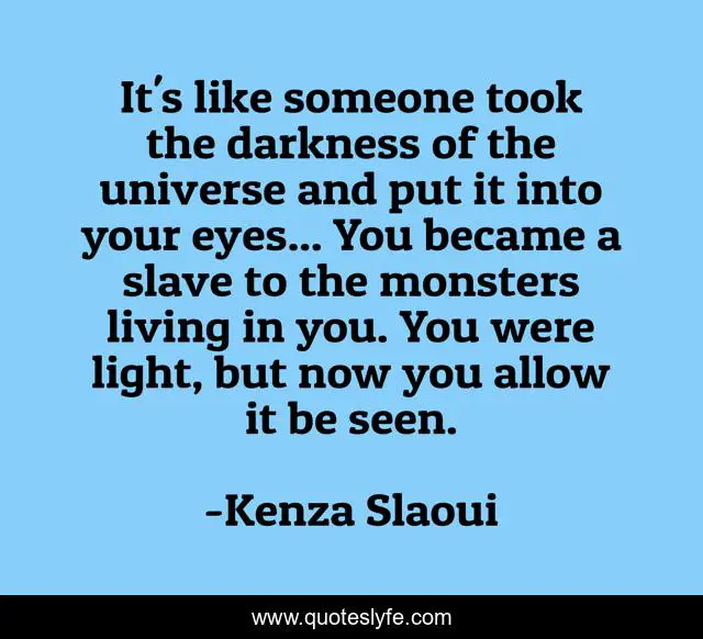 This page presents the quote "It's like someone took the darkness of the universe and put it into your eyes... You became a slave to the monsters living in you. You were light, but now you allow it be seen.". Author of this quote is Kenza Slaoui. .