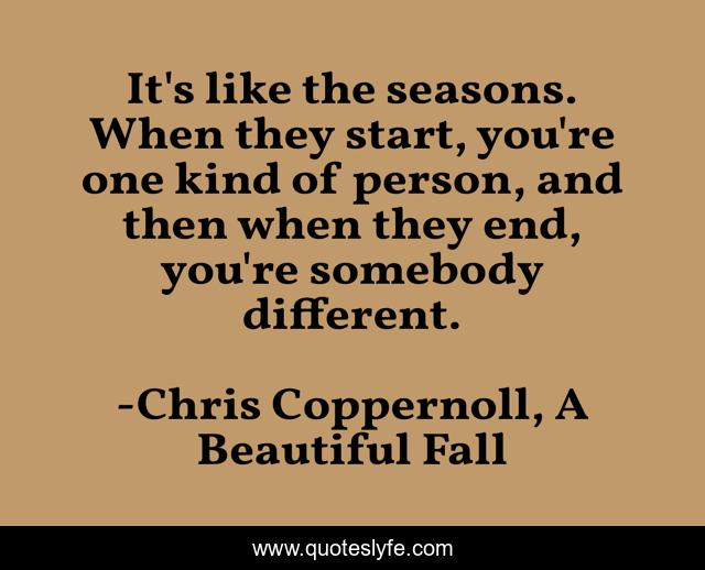 This page presents the quote "It's like the seasons. When they start, you're one kind of person, and then when they end, you're somebody different.". Author of this quote is Chris Coppernoll, A Beautiful Fall. This quote is about life, growth, change,.