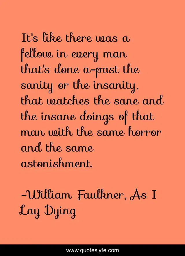 This page presents the quote "It's like there was a fellow in every man that's done a-past the sanity or the insanity, that watches the sane and the insane doings of that man with the same horror and the same astonishment.". Author of this quote is William Faulkner, As I Lay Dying. This quote is about sanity, self-awareness, duality, insanity,.
