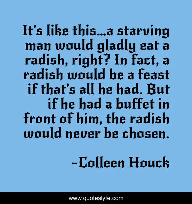 This page presents the quote "It’s like this…a starving man would gladly eat a radish, right? In fact, a radish would be a feast if that’s all he had. But if he had a buffet in front of him, the radish would never be chosen.". Author of this quote is Colleen Houck. This quote is about romance, humor, love, affection,.