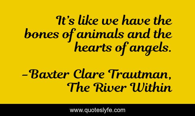 This page presents the quote "It’s like we have the bones of animals and the hearts of angels.". Author of this quote is Baxter Clare Trautman, The River Within. This quote is about humanity, inspirational, enthusiasm, angels, war, hope,.