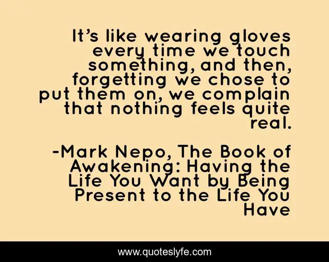"Mark Nepo, The Book of Awakening: Having the Life You Want by Being Present to the Life You Have Quotes." Quoteslyfe.com, 2025. Sat. 06 Dec. 2025. <https://www.quoteslyfe.com/quote/It-s-like-wearing-gloves-every-time-93739>.