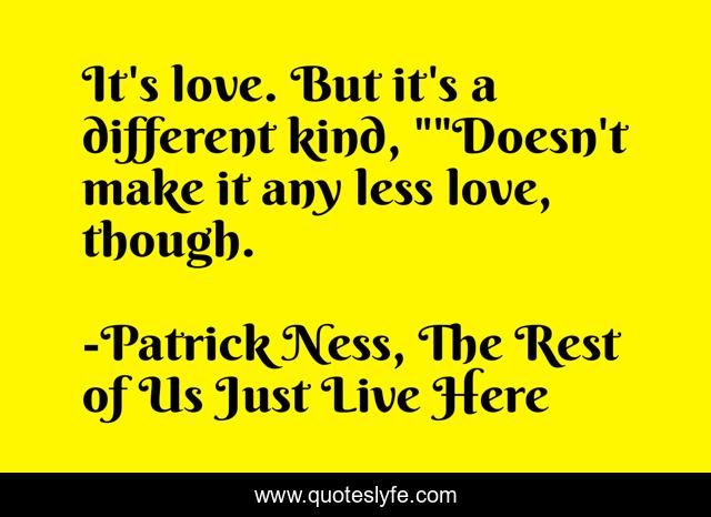 This page presents the quote "It's love. But it's a different kind, ""Doesn't make it any less love, though.". Author of this quote is Patrick Ness, The Rest of Us Just Live Here. This quote is about friendship, love, affection,.