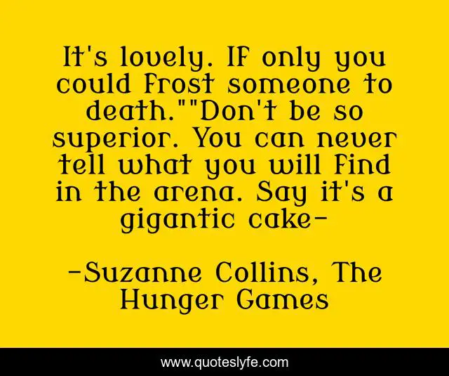 This page presents the quote "It's lovely. If only you could frost someone to death.""Don't be so superior. You can never tell what you will find in the arena. Say it's a gigantic cake-". Author of this quote is Suzanne Collins, The Hunger Games. .