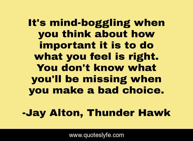 This page presents the quote "It's mind-boggling when you think about how important it is to do what you feel is right. You don't know what you'll be missing when you make a bad choice.". Author of this quote is Jay Alton, Thunder Hawk. This quote is about life, adulthood, consequences, choices, inspirational, enthusiasm, decisions,.