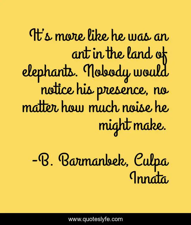 This page presents the quote "It’s more like he was an ant in the land of elephants. Nobody would notice his presence, no matter how much noise he might make.". Author of this quote is B. Barmanbek, Culpa Innata. This quote is about utopia, future, science-fiction, crime,.