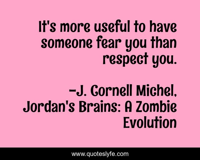 This page presents the quote "It's more useful to have someone fear you than respect you.". Author of this quote is J. Cornell Michel, Jordan's Brains: A Zombie Evolution. This quote is about apocalyptic, use, someone, useful, zompoc, fearful, zombie-apocalypse, zombie, important,.